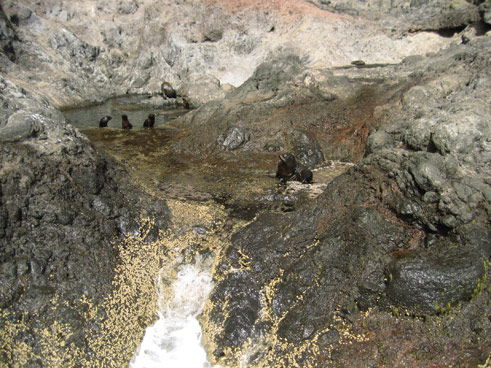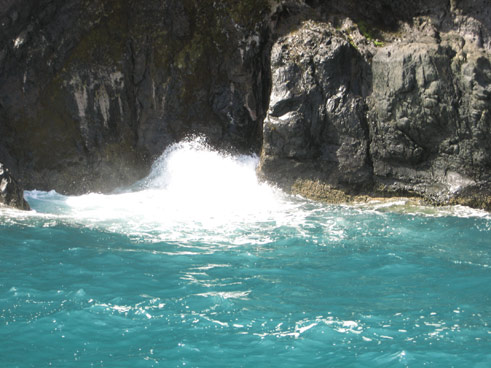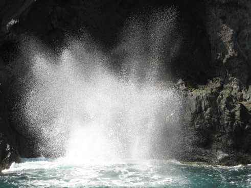 | Das war ein Blowhole. Die welle presst die Luft im inneren der hole zusammen, welche ja nicht entweichen kann solange das wasser ansteigt und wenn der wasserspiegel nach der welle wieder singt, sprüht die Luft das wasser heraus. | ::::::::::![]() |