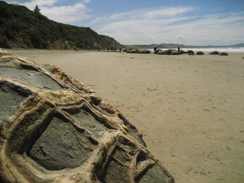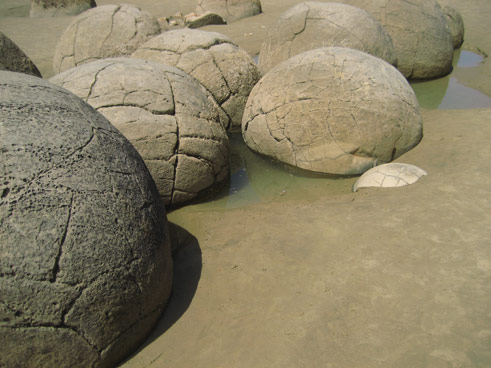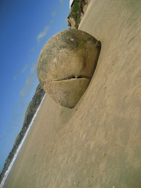 | Der hier ist dann doch etwas grösser so ca. 1.2m im durchmesser und erstaunlich gleichmässig.. die Moeraki Boulders. es ist nicht so wirklich klar warum die so sind wie sie sind, aber man vermutet, dass sie in der erdewachsen durch ringförmige anlagerung von mineralen um einen kern. könnten aber auch dinoeier sein oder? | ![]() |